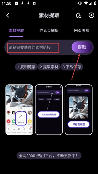 在素材提取页面的输入框中粘贴需要处理的素材链接,然后点击【提取】按钮。