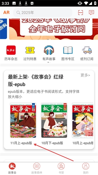 在应用首页找到【最新上架・《故事会》红绿版-epub】板块,点击【11月上-epub版】即可进入详情页面。
