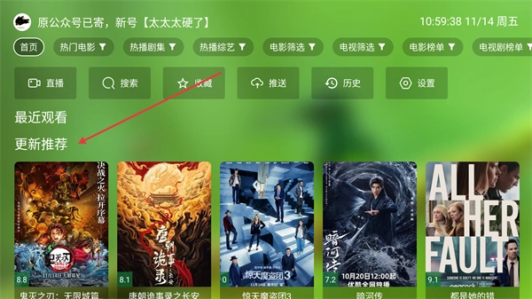 添加完成后,在OK影视Pro的首页,就能看到【更新推荐】板块里的影视内容了。