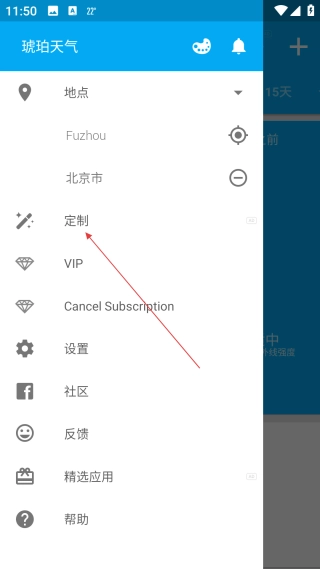 在天气应用的界面里,点击位于左上角的【菜单按钮】,就能进入到功能菜单界面。