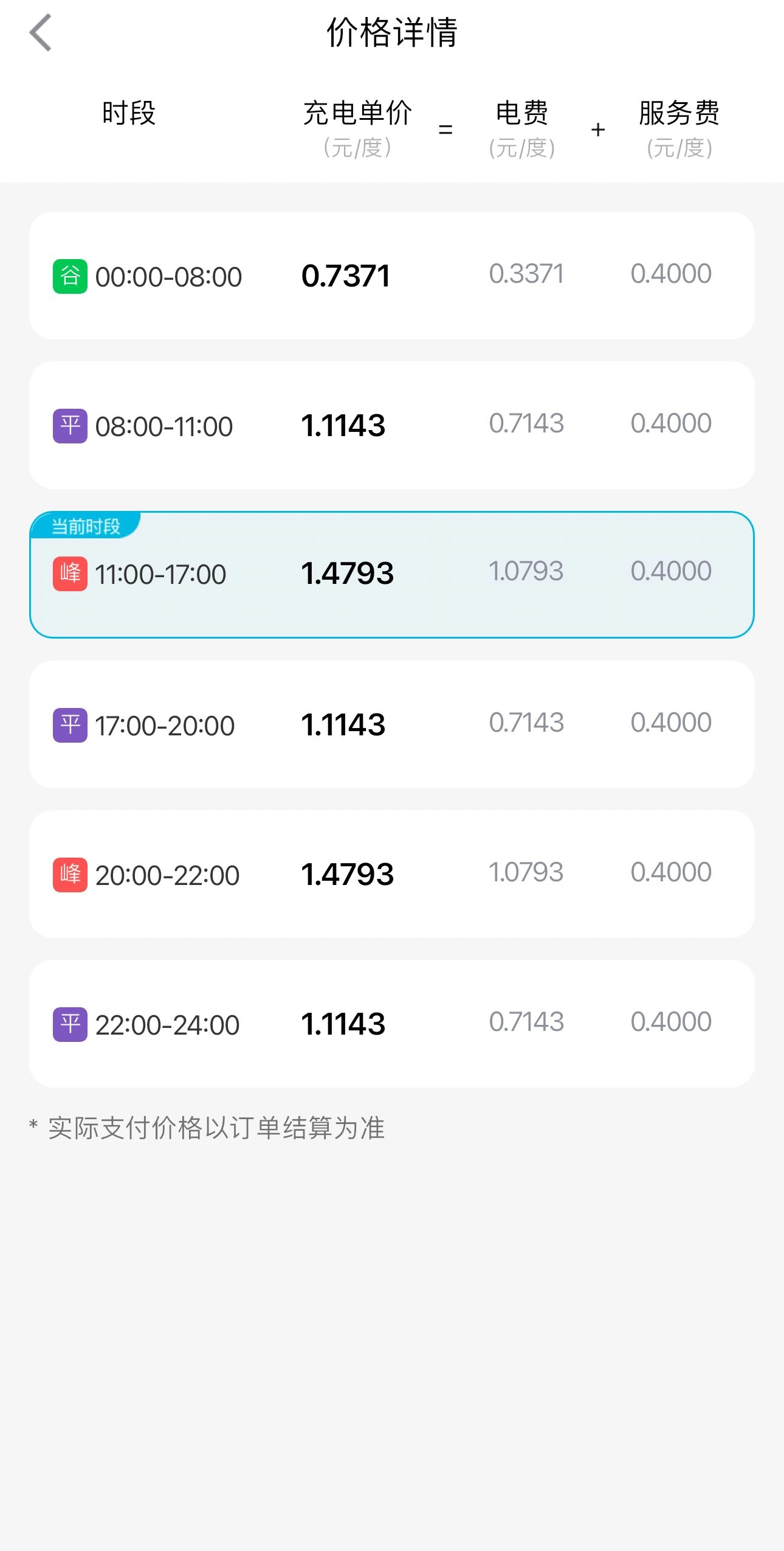 点击“价格详情”按钮,查看并对比不同时段(峰、谷、平)的电费与服务费明细。