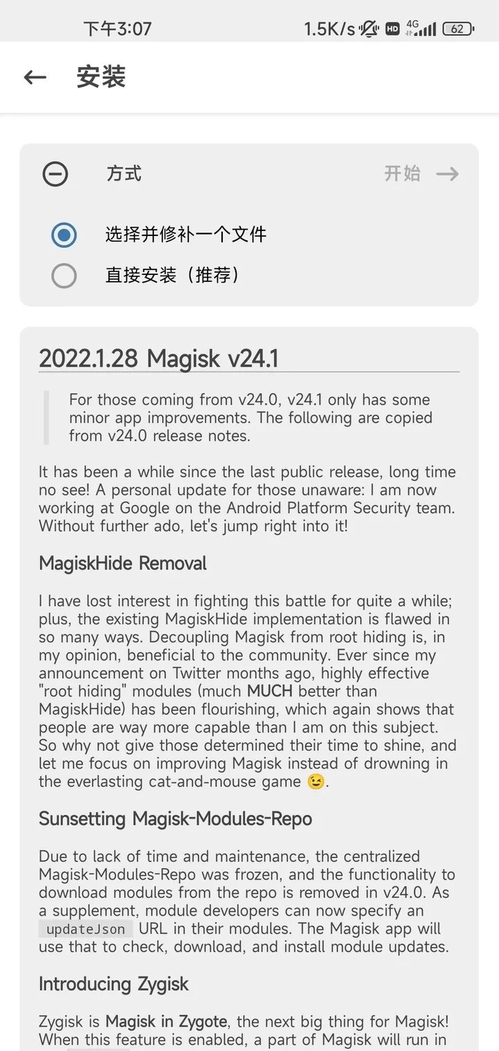 3、在Magisk首页点击安装界面里的两个选项(若出现持续显示“正在检查更新”的情况,可进入Magisk设置,将更新通道切换为自定义,并填入链接:https://qianyegroup.gitee.io/magiskbuilds/updates/custom_md2.json);