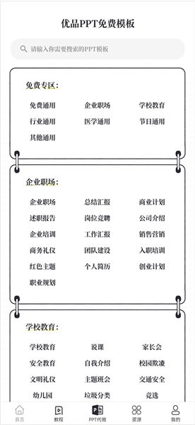 2、应用的首页上,展示着不同风格与不同类型的PPT模板分类板块