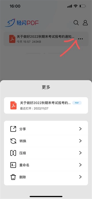 3、点击三个小点,就能对文件进行压缩、分享、转换等操作。