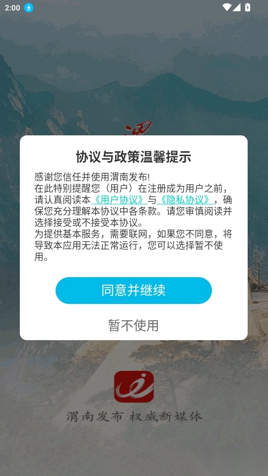 1. 启动软件后,阅读“协议与政策温馨提示”的相关内容,随后点击“同意并继续”按钮进入下一步。
