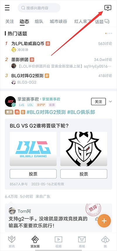 进入“盟友圈”后,点击页面右上角的“对话”图标。