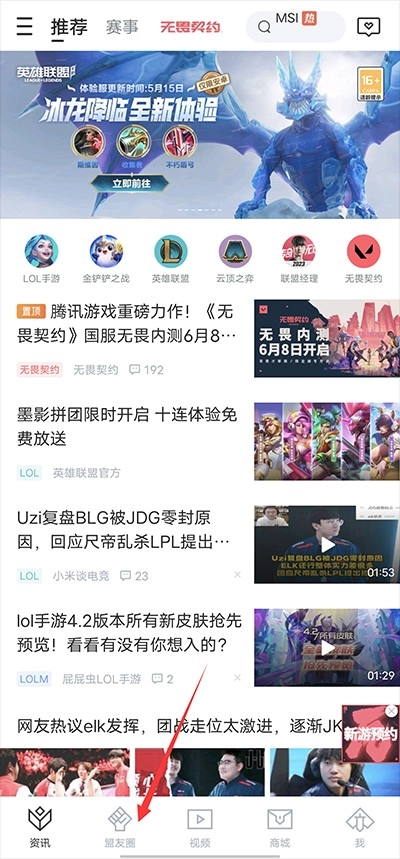1、打开掌上英雄联盟安卓版,点击页面底部菜单栏里的第二个选项“盟友圈”。