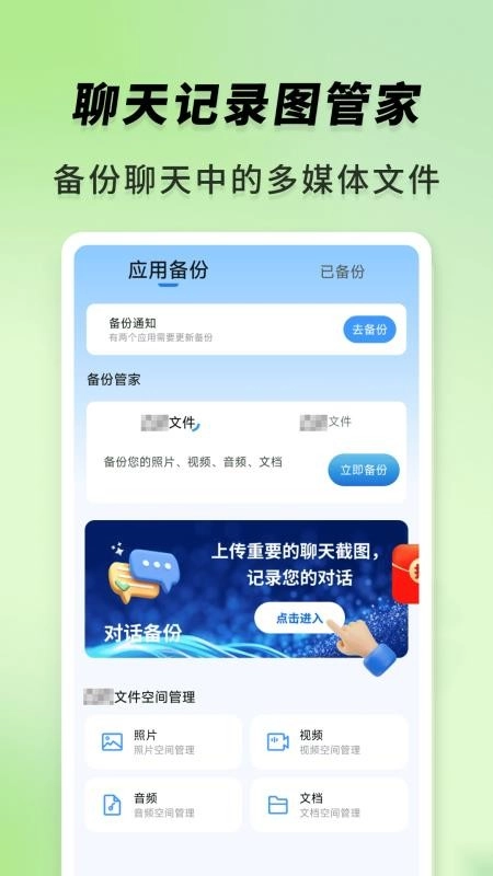 聊天记录图管家为用户日常备份文件提供了便捷方式,能轻松将所有重要媒体文件备份保存,不仅可长时间安全存储,还不会影响文件分辨率,更无需担心数据泄露问题,可满足用户个性化使用需求;这是一款简单易用的文件备份软件,没有复杂操作流程,快来体验吧!