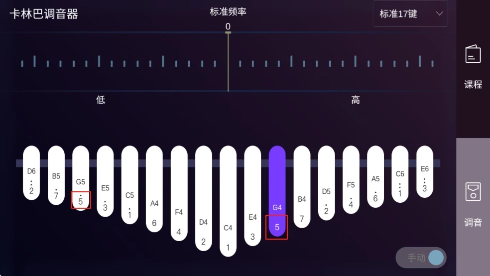 这个音偏低,得往上调一调。调律的规律是:音低就敲对应的低音位置,音高就敲对应的高音位置——只要把卡林巴的顶端看作高处,底端看作低处就行。比如这个so音,现在偏低,就拿小锤子找到它,从下往上敲低音区域,敲两下,再弹一下;等看到光标变成绿色,就说明音调准了。