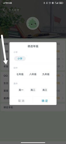2、进入个人信息界面后,能看到多项可设置的信息,其中包含【年级】选项。点击该选项,重新选择对应的年级就完成了。