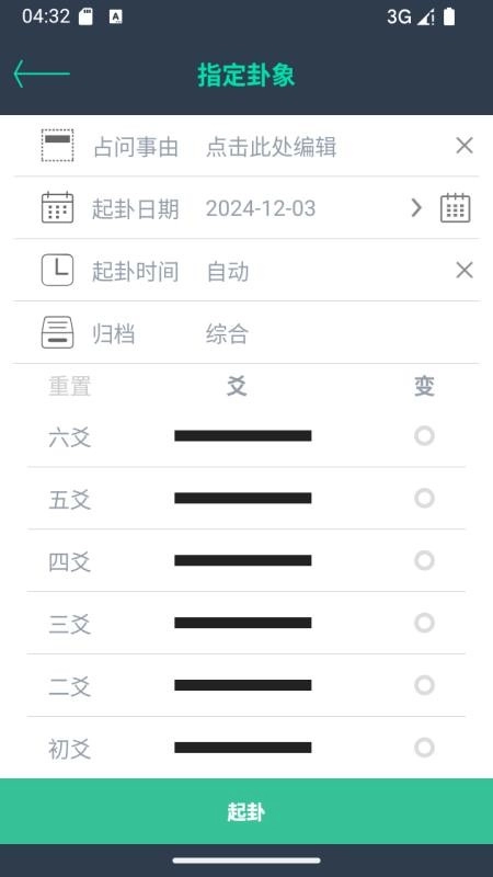 2、选择对应的占问事由、起卦日期、起卦时间等信息,就能完成起卦操作。