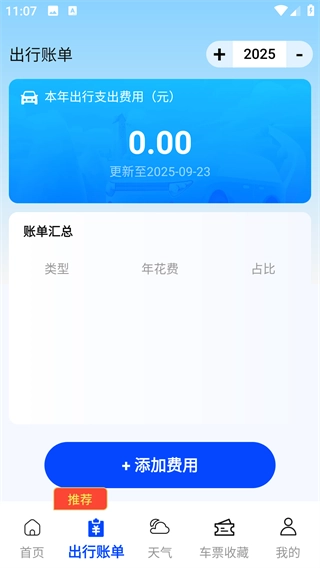 3、点击下方的出行账单,即可查看详细的账单记录,页面下方还设有“添加费用”按钮,点击该按钮就能添加你的出行账单。
