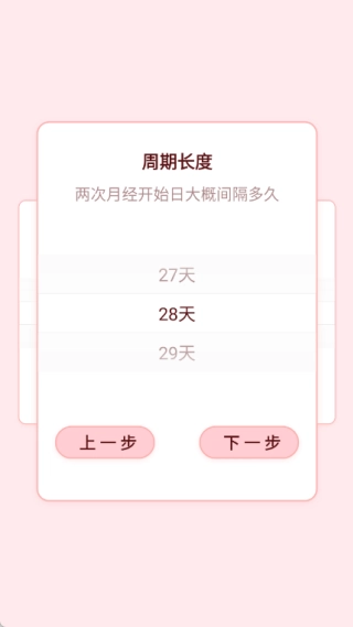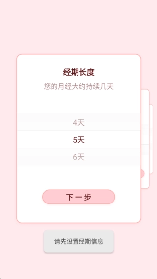 1、打开软件后,先对经期长度进行设置,选定天数后点击下一步;