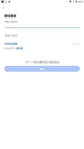 4、第四步,输入密码进行登录,此时先选择立即注册,并勾选智车管家用户协议。