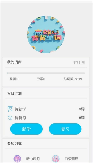 3、根据自身学习程度挑选适配的词汇库与学习方案,设有待学及复习单词板块,每日依照规划执行。
