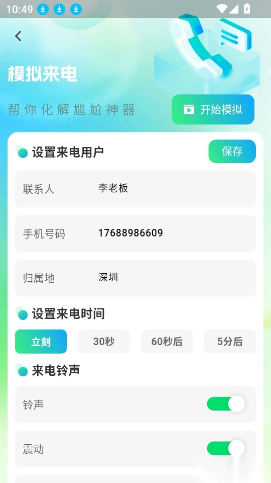 3、接着配置来电用户的相关信息、来电时间以及铃声,随后点击界面右上方的“开始模拟”按钮,以推进到下一步操作。