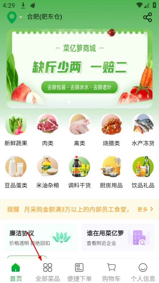 1、进入菜亿箩首页后,点击下方的全部菜品进入。