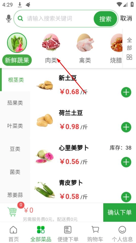 2、在全部菜品页面,点击你想要购买的商品,比如页面上方的肉类。