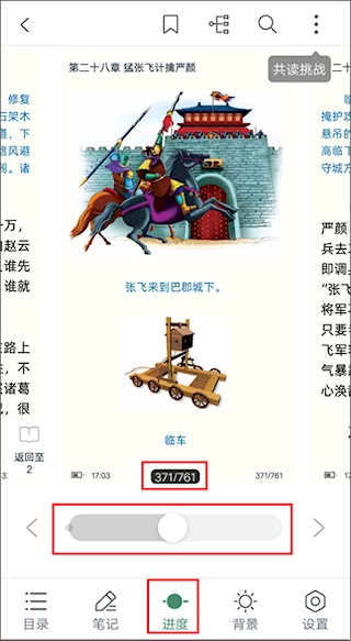③进度调整:在阅读页面点击正中间位置呼出菜单,选择「进度」选项后,拖动进度条即可快速跳转到目标页数。