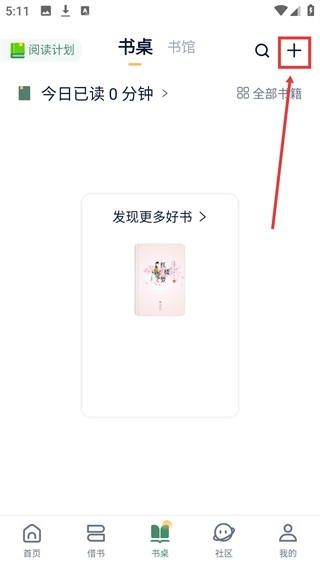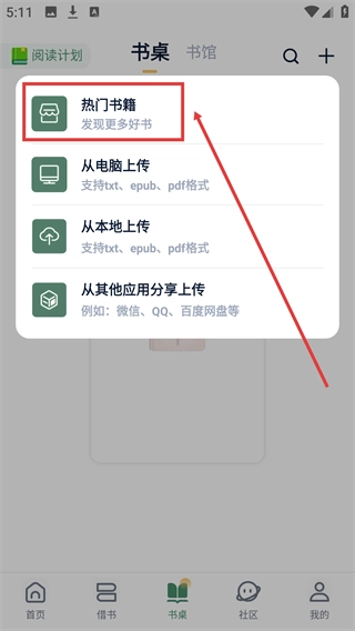 点击【+】按钮后会弹出选项菜单,从中选择【热门书籍】选项即可进入对应的页面。