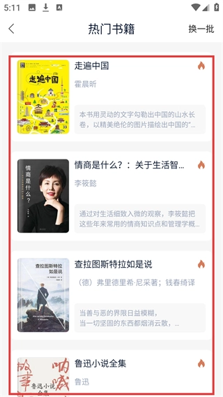 进入【热门书籍】页面后,就能看到像【走遍中国】、【情商是什么?】这类书籍,要是想换些推荐内容,点击【换一批】按钮就可以刷新了。