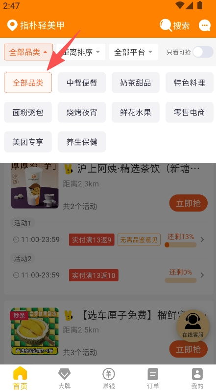 在分类列表中点击目标店铺的立即抢。
