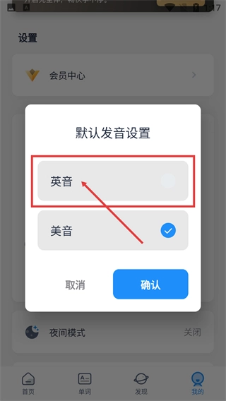 在【默认发音设置】弹窗里选定【英音】选项,再点击【确认】按钮,就能把默认发音切换成英音了。