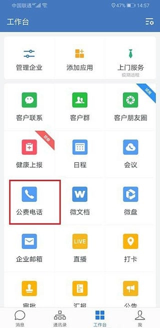 2、接下来我们尝试使用公费电话功能,具体操作是打开企业微信,点击公费电话选项,再选择打电话,操作步骤可参考下图: