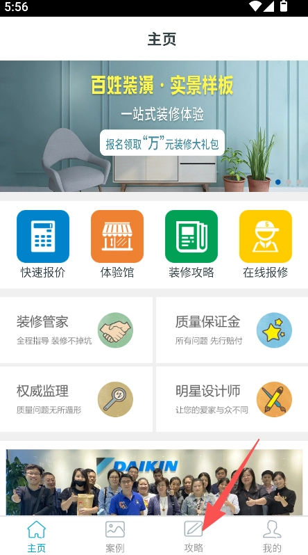 设有快速报价、体验馆等功能,同时提供装修管家、质量保证金等服务;装修攻略板块则用于展示行业新闻与家装攻略。