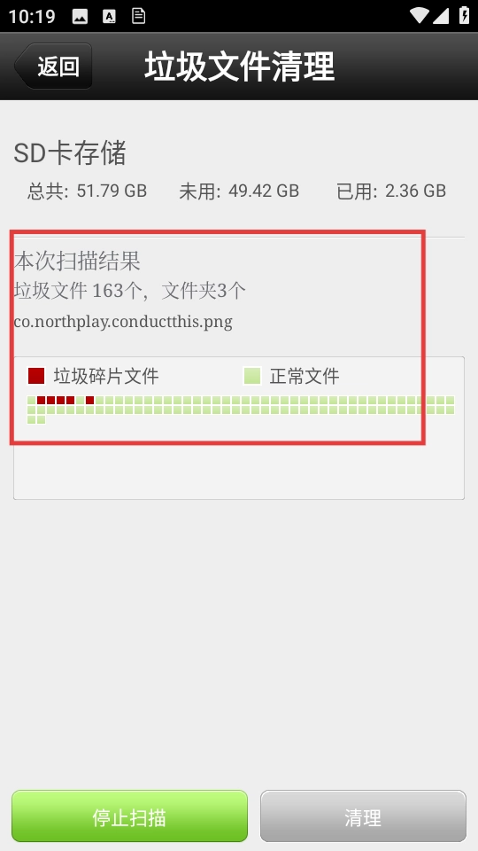 在文件分类浏览页面,点击底部的【垃圾碎片文件扫描】按钮,即可进入存储状态界面。