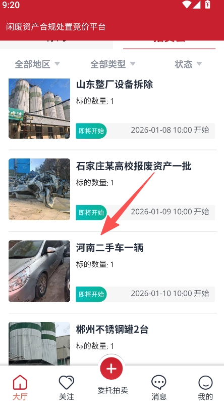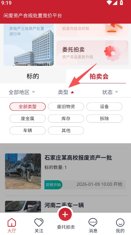 打开软件进入大厅,选择标的类型如废旧物资。