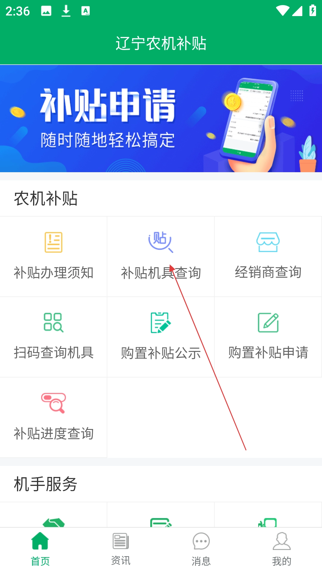 进入首页后,点击【补贴机具查询】选项,即可启动补贴相关的操作流程。