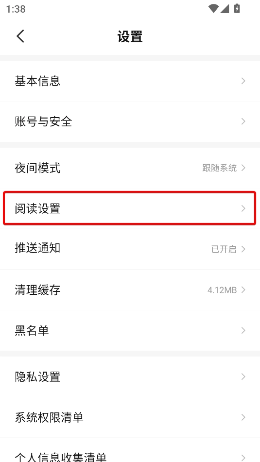 找到“阅读设置”,点击进入