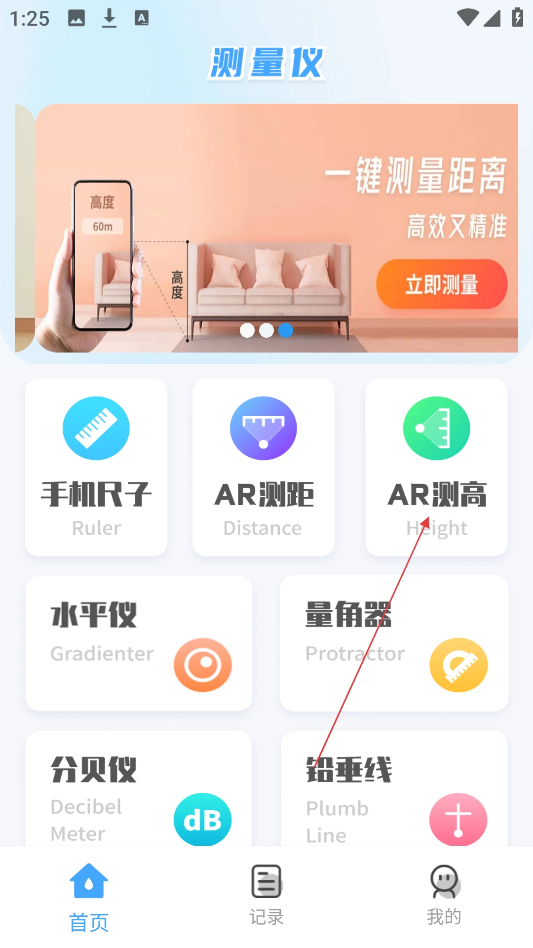 在测量仪的首页找到并点击【AR测高】选项,即可进入AR测高的设置页面。