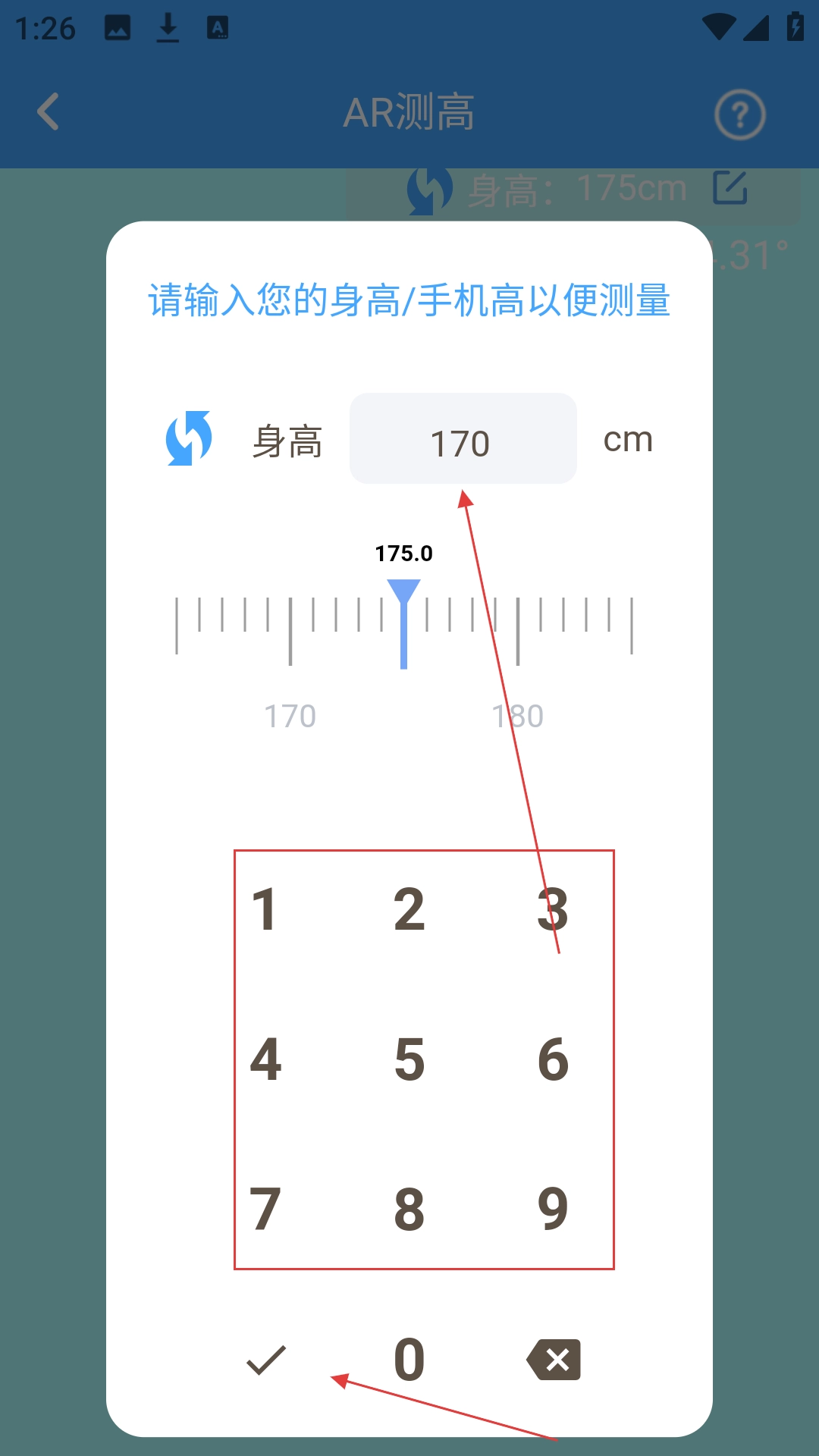 在AR测高的设置页面中,点击【输入身高方框】,进入输入身高或手机高度的界面后,点击确认按钮即可。