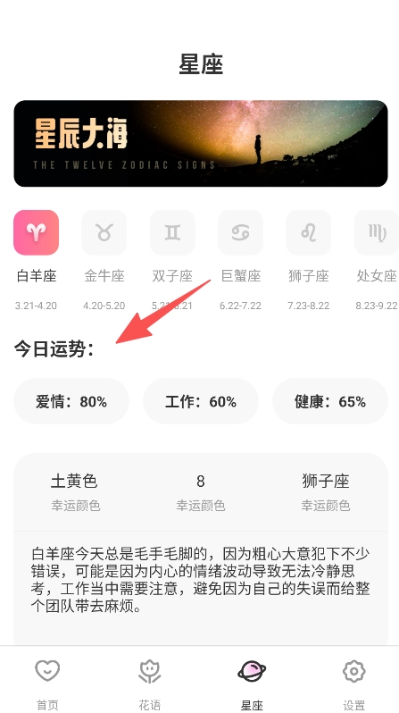 切换至星座板块,挑选对应的星座,查看今日的运势内容,获取与星座相关的兴趣信息。