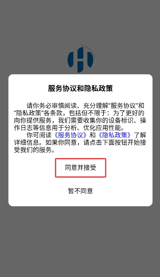 首次启动应用时会弹出用户协议窗口,点击“同意”按钮后就能进入汽修服务平台的主界面。