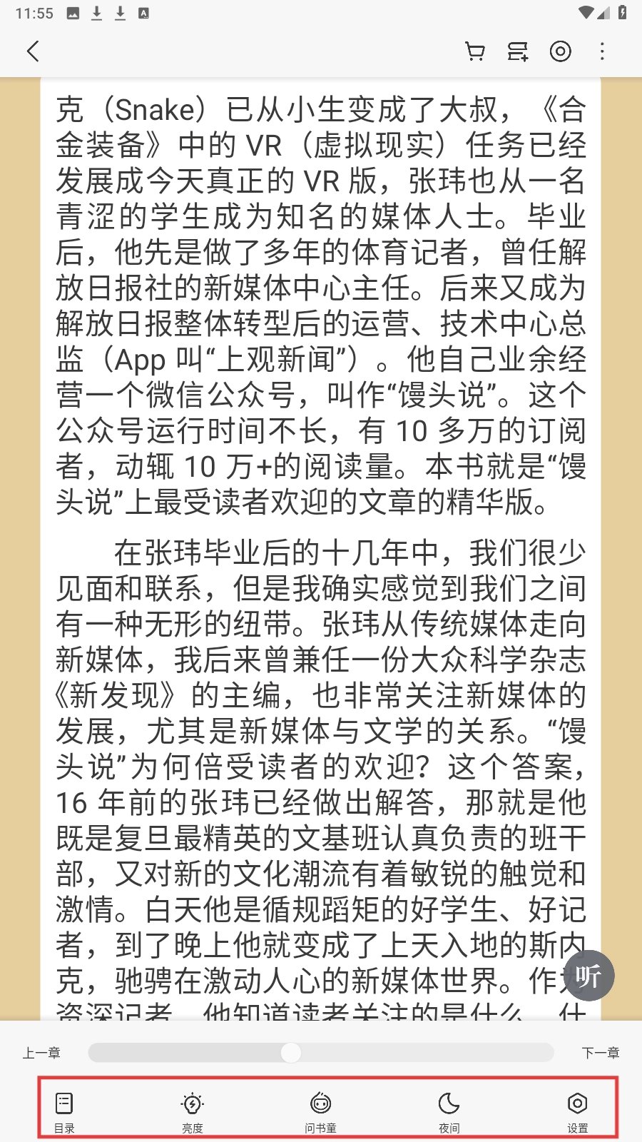 在阅读时,你可以点击屏幕下方的功能栏,借助【目录】【亮度】等功能来辅助阅读。