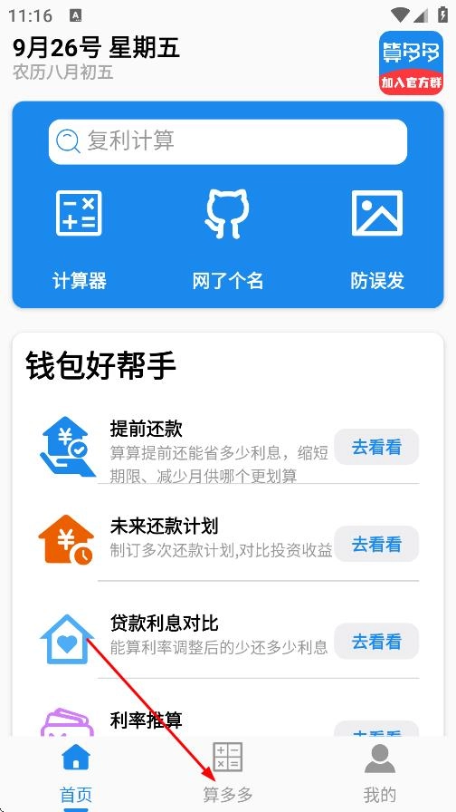 2、在算多多主页面,点击“算多多”按钮,进入功能选择页面。
