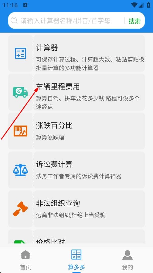 3、进入功能选择页面后,找到并点击“车辆里程费用”选项,即可进入车辆里程费用计算页面。