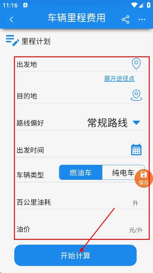 4、填写出发地、目的地等相关信息后,点击“开始计算”按钮,系统就能自动核算出车辆的里程费用。