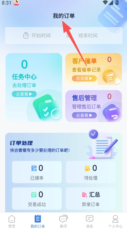 提供我的订单页面,该页面包含任务中心、客户催单以及售后管理功能,能够展示已接单、待处理等各类订单状态。