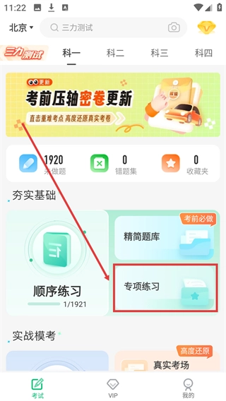 进入科目一页面后,找到并点击“专项练习”模块,就能进入科目一专项练习页面。