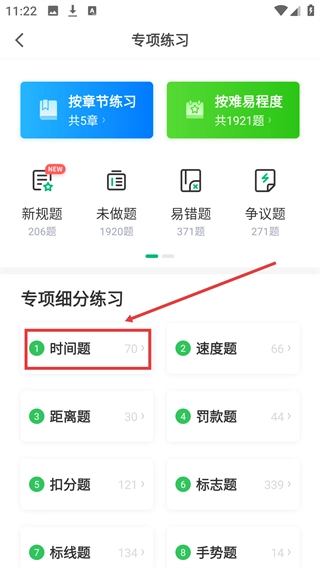进入【专项练习】页面后,选择【时间题】选项,就能练习科目一的时间类题目了。
