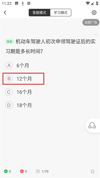 进入【时间题】答题页面后,当前处于【答题模式】,需要回答“初次申领驾驶证的实习期时长”这道单选题,选择【12个月】即可完成该题作答。