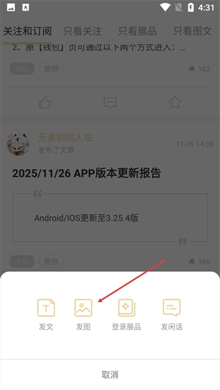 在弹出的发布选项弹窗中,选择【发图】选项。