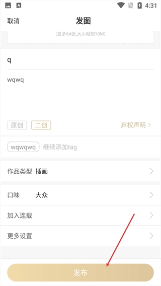 请按顺序完成【上传图片】【标题】【正文内容】等信息的填写以及相关属性的设置。