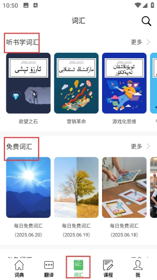 切换到页面底部的【词汇】模块后,可浏览其中的【听书学词汇】和【免费词汇】板块,进而查看各板块对应的词汇内容。