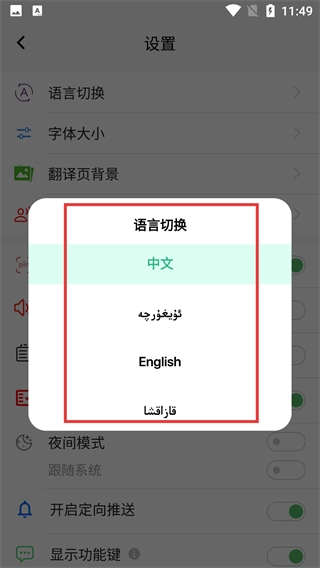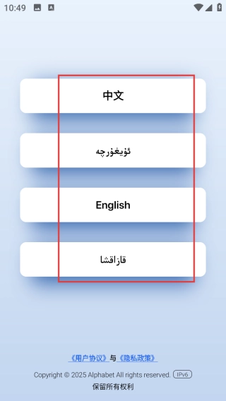 在应用的语言选择页面,点击【中文】【维吾尔语】【English】等选项,选定语言后即可进入应用。