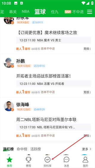 在篮球赛事页面,点击底部导航栏的【资料库】按钮。